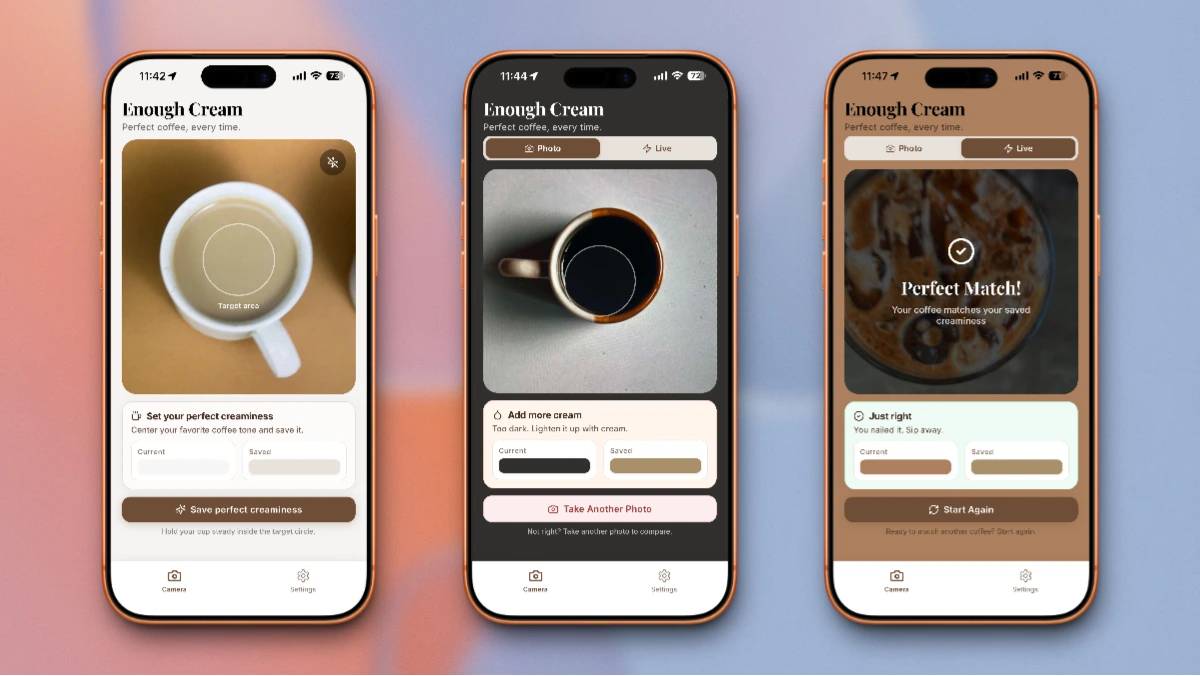 It's not just about light or dark. Enough Cream analyzes saturation, hue, and brightness to distinguish between a "milky" coffee and a "creamy" coffee. Our algorithm adapts to ambient lighting, ensuring your kitchen lights don't throw off your perfect cup.